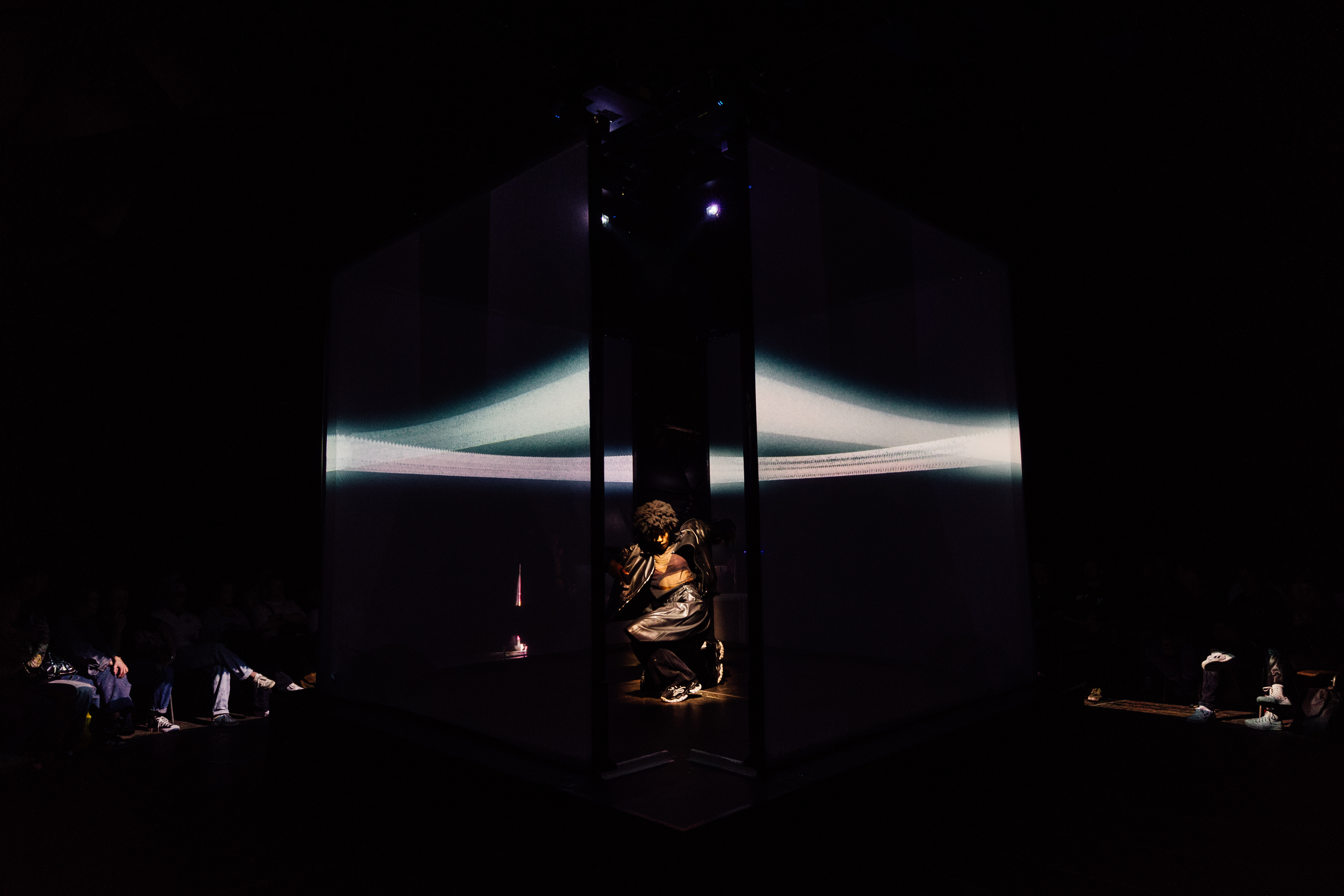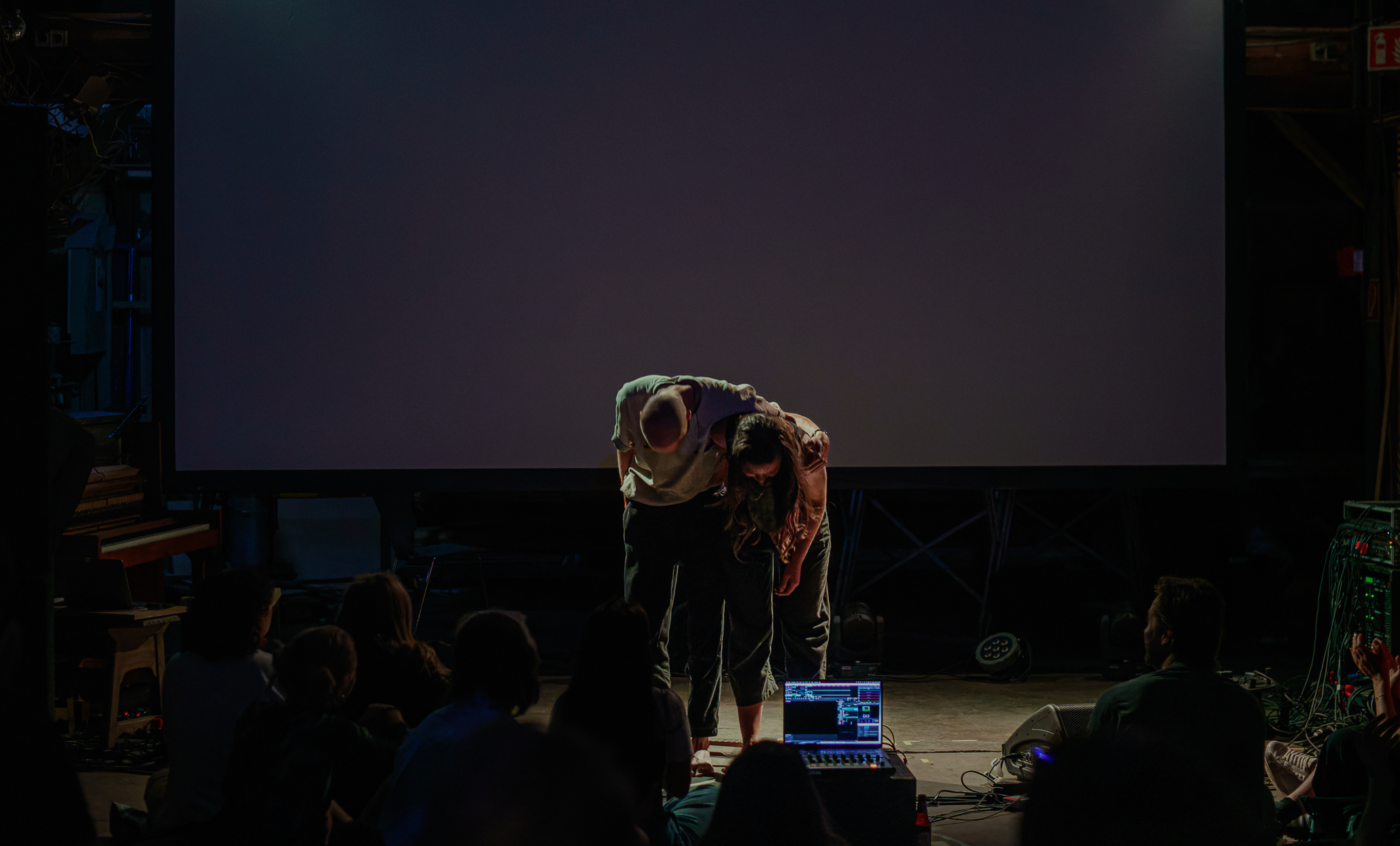 ‘hide’ (2022) is a work created and performed by Twan Bracco Gartner and Cris Mollee. Twan is a composer and sound artist with an equal fascination for melody and noise. In ‘hide’ he makes use of recurring musical themes and variations to mirror his perception of and interaction with the outside world. Cris is a creative technologist and scenographer with an interest in digital physicality. She uses the human body as a medium to explore computer perception and computer interpretation to investigate embodiment.